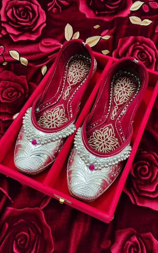 This Customised Silver Bridal Jutti is a timeless bridal classic, crafted with a hand-embossed silver base and beautifully finished with a delicate pearl-lined border. A subtle ruby accent stone at the front adds a touch of royal elegance without overpowering the design.
