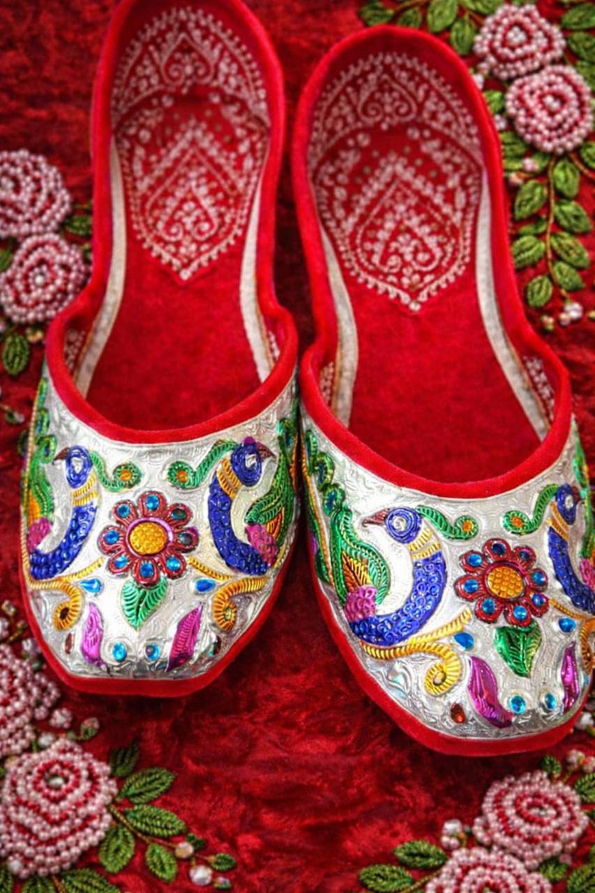 This Customised Silver Jutti showcases exquisite handcrafted silver work highlighted with vibrant meenakari peacock and floral motifs in rich shades of blue, green, pink, and gold. The detailed embossing reflects traditional artistry, while the soft red velvet inner lining ensures superior comfort and a luxurious feel.