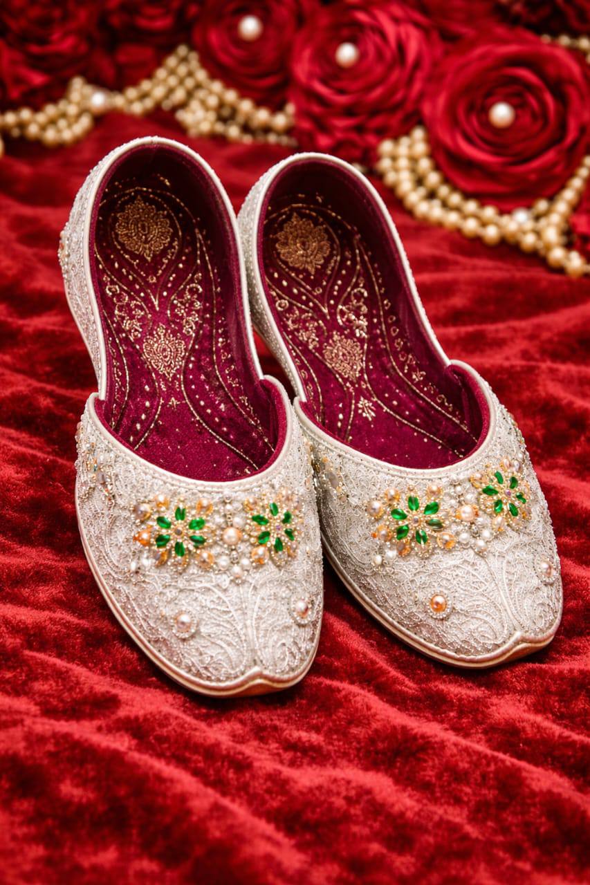 Perfect for weddings, festive occasions, and traditional celebrations, the Emerald Pushp Pearlwork Silver Mojris pair beautifully with lehengas, sarees, and ethnic wear—offering a refined blend of tradition, comfort, and timeless beauty.