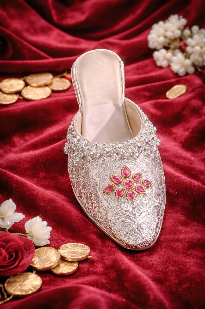 The Gulnaar Rosette Silver Embossed Mojris showcase refined craftsmanship with a graceful floral-inspired centerpiece set in rich ruby-toned accents. The silver-finish exterior is adorned with intricate hand-embossed patterns, creating a luxurious texture that reflects traditional artistry.