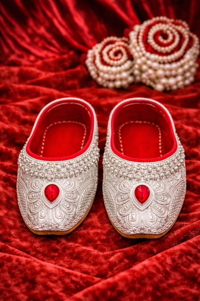 The Laal Noor Silver Pearl Mojris are a refined expression of elegance rooted in traditional craftsmanship. Crafted with a finely embossed silver-toned exterior, these mojris feature intricate floral patterns that create a rich, textured surface inspired by classic heritage motifs.