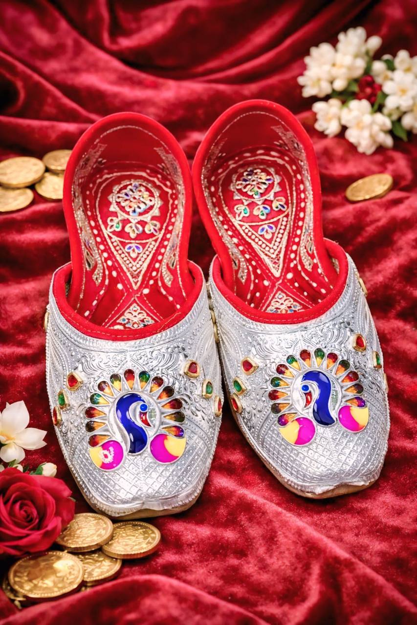 The Mor Noor Rangrez Silver Peacock Mojris are a celebration of vibrant artistry and refined craftsmanship. Designed with a richly textured silver-toned base, these mojris feature an eye-catching peacock motif highlighted with multicolored enamel accents that add depth, grace, and royal charm. Intricate embossing across the surface enhances the traditional aesthetic, while gemstone-style detailing elevates the overall look.