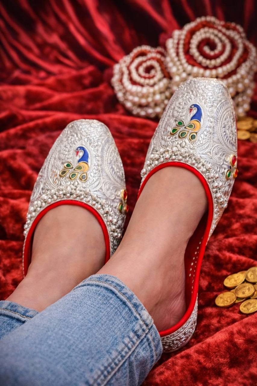 The Mor Noor Silver Peacock Mojris are a graceful tribute to royal Indian artistry and timeless elegance. Crafted with a finely embossed silver-toned exterior, these mojris feature intricate heritage patterns that create a rich, textured finish inspired by traditional palace craftsmanship.