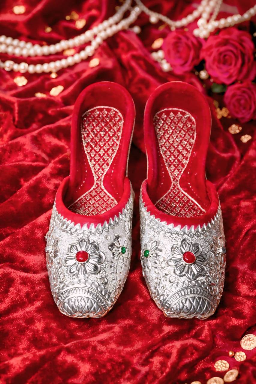 The front is adorned with delicate floral motifs highlighted by ruby-red and emerald-green stone accents, creating a subtle yet regal focal point. The scalloped silver edging enhances the classic silhouette, while the deep red inner lining, patterned with traditional designs, offers superior comfort and a luxurious contrast.