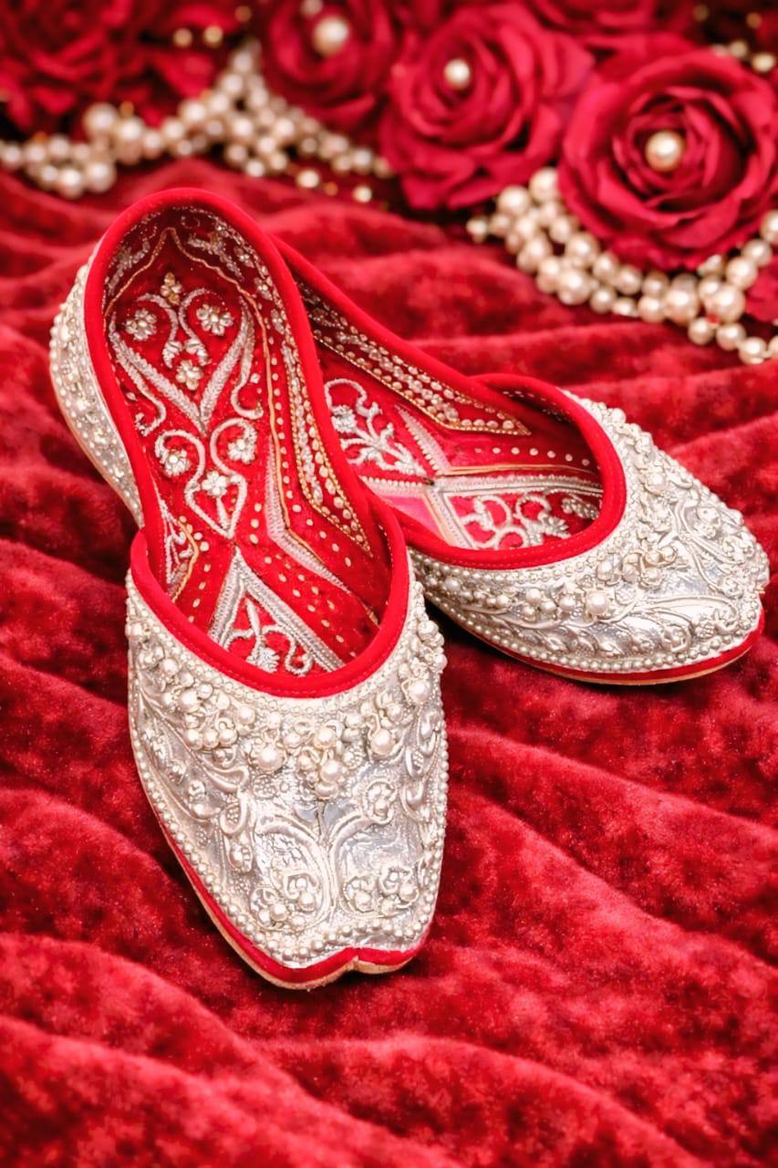 Perfectly suited for weddings, festive occasions, and ceremonial wear, the Rajwada Pearl Bloom Silver Mojris pair effortlessly with lehengas, sarees, and ethnic ensembles—making them a timeless statement of grace, tradition, and refined luxury.