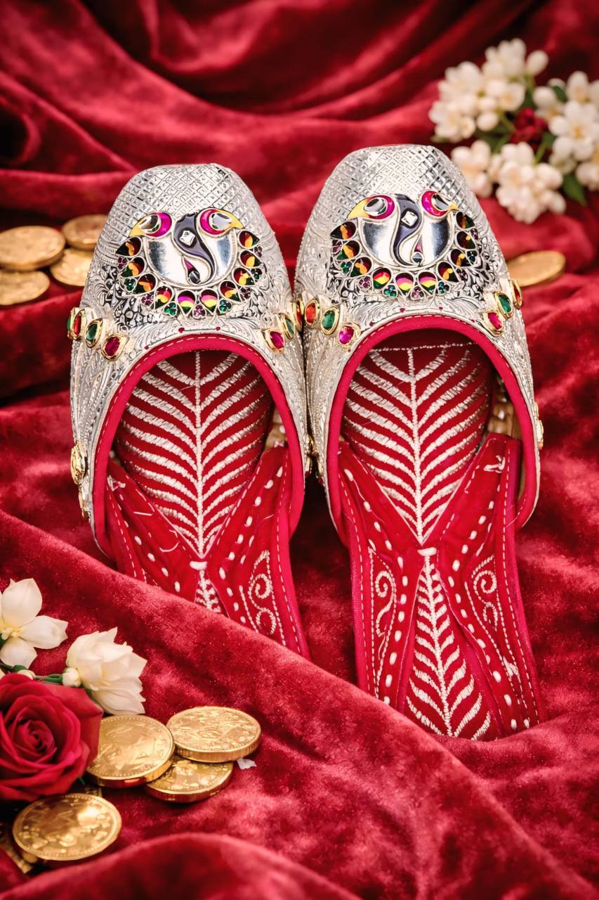 The Rangrez Mayur Silver Embossed Mojris are a celebration of vibrant artistry and traditional elegance. Crafted with a finely textured silver-toned exterior, these mojris feature an exquisite peacock-inspired centerpiece accented with multicolored enamel detailing that brings life and character to the design.