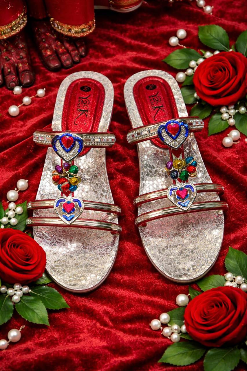 Add a touch of royal elegance to your festive look with the Royal Heart Bloom Silver Slides. Designed with a textured silver-finish sole and double slim straps, these slides are adorned with heart-shaped enamel charms and multicolor stone clusters that bring out a vibrant, celebratory charm.