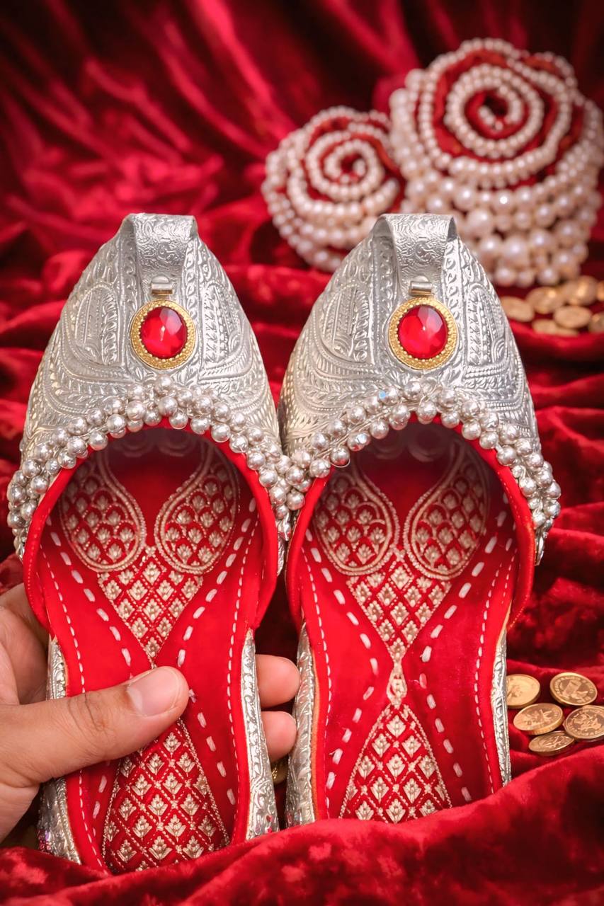 The Shahi Laal Mani Silver Pearl Mojris are a magnificent expression of royal elegance and meticulous craftsmanship. Crafted with a finely engraved silver-toned exterior, these mojris showcase intricate traditional embossing inspired by classic palace artistry, creating a rich and textured visual appeal.