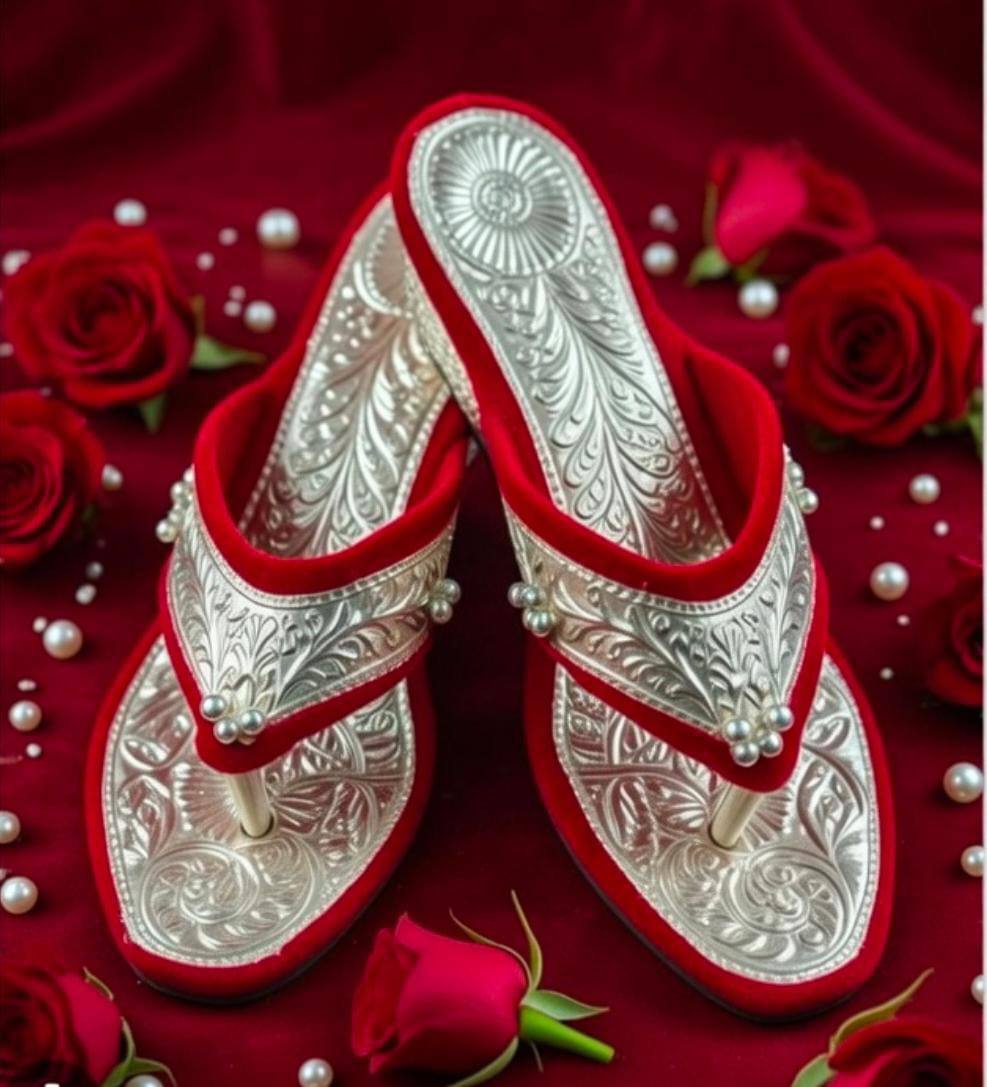 The Silver Pearl V-Style Kolhapuri features an elegant V-shaped strap design with intricate silver embossing and delicate pearl detailing at the center. Finished with a rich red velvet lining, this pair offers both luxury and comfort.