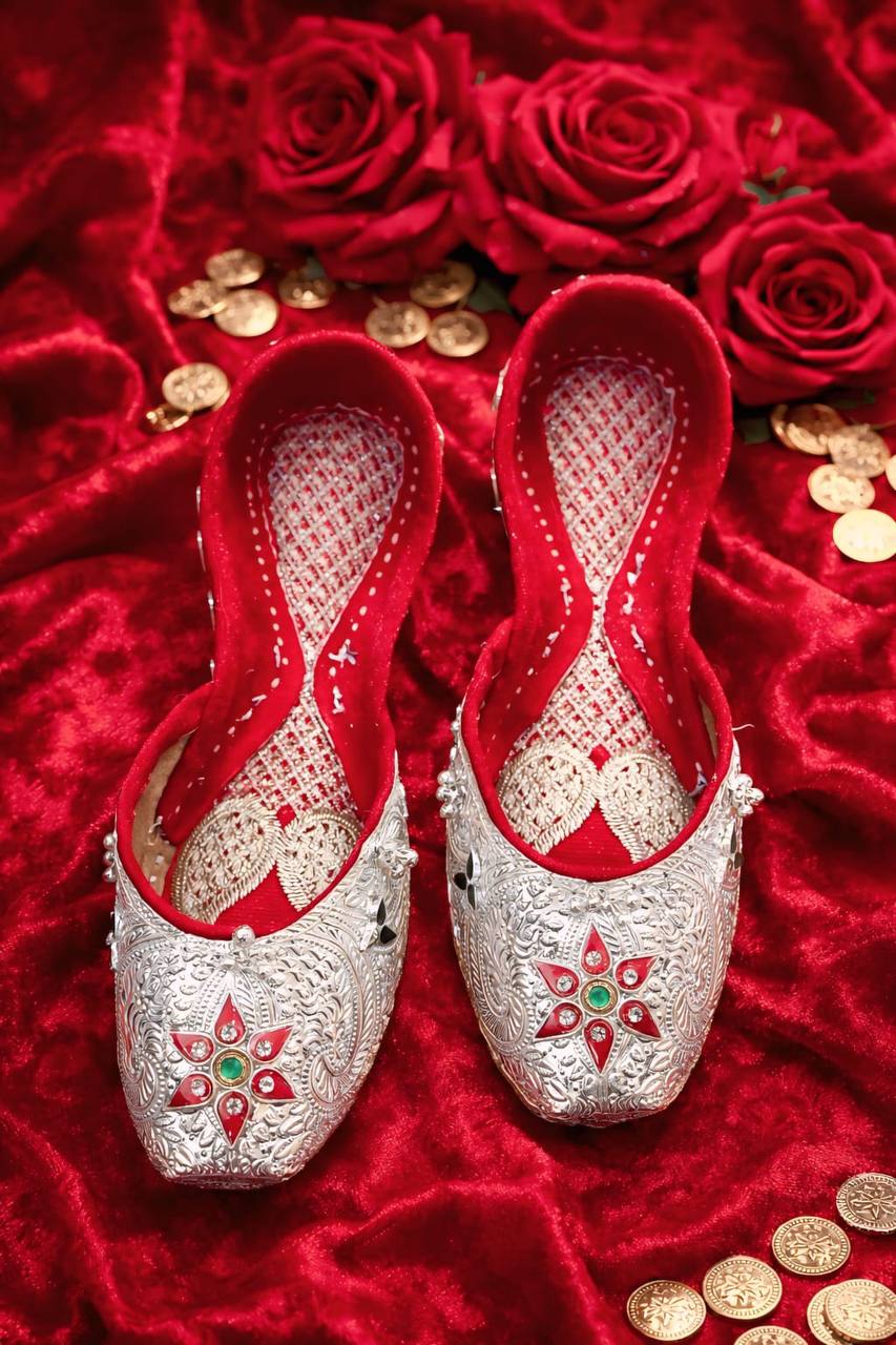 The Zar-E-Gul Silver Star Embellished Mojris are a celebration of fine artistry and traditional luxury. Designed with a beautifully engraved silver-toned exterior, these mojris feature a striking star-shaped gemstone motif highlighted with rich red and green accents, creating a bold yet elegant focal point.
